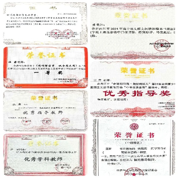 汪君,中学语文高级教师,内江市主题演讲比赛优秀指导教师,内江市市直优秀学科教师,内江二中高中语文教研组长。她秉承着“让语文课堂成为学生放眼世界,领悟人生的精神殿堂”的教育信念。从教近三十载,所带历届高中毕业班高考成绩均列全市前茅,实验班、基地班均列全市第一。汪老师乐教善研,教法精湛,多次执教市级、市直级示范课、公开课均获好评;多次荣获国家级、省级、市级征文大赛指导奖。主研的国家级课题获全国一等奖,撰写的多篇论文分获国家级、省级、市级各类奖项,并公开发表在多家刊物上。
